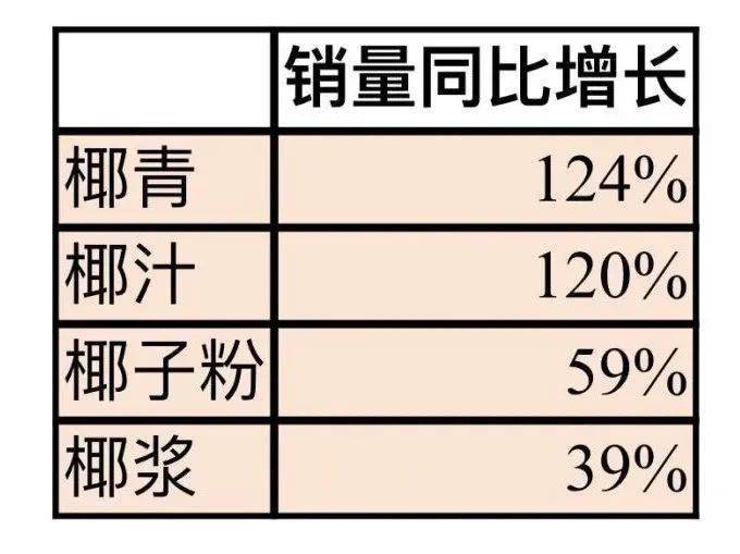 為何椰制品近年來廣受市場歡迎?業(yè)內(nèi)人士普遍分析認(rèn)為這與椰制品“新奇”與“健康”等元素相關(guān)。目前,主打“輕健康”理念的植物蛋白類飲料大受市場歡迎,根據(jù)《2020植物蛋白飲料創(chuàng)新趨勢》,椰子風(fēng)味在植物蛋白飲料中增長也處于最快梯隊(duì),增速高達(dá)109%。